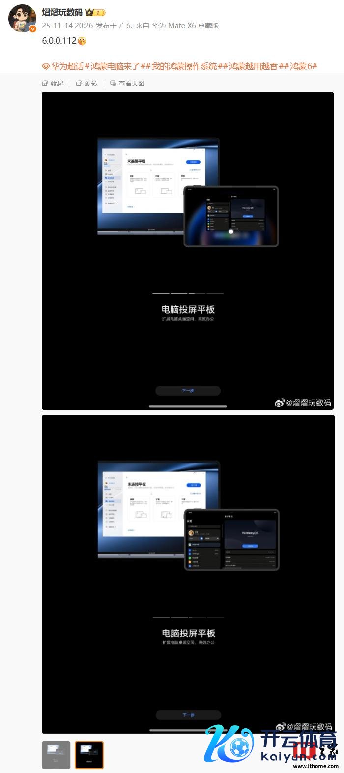 IT之家 11 月 15 日音书,博主 @熠熠玩数码 昨晚分享一组图片,展示了“电脑投平板”的功能演示,并配文“6.0.0.112”。皆集褒贬区决策来看,博主所指预测为鸿蒙 HarmonyOS 操作系统的 6.0.0.112 版块更新践诺。
