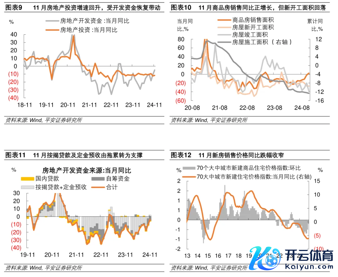 “930”新政以来,房地产市集积极信号增多,增量策略落地带动房地产销售、房价和斥地资金同步回暖。11月商品房销售面积单月同比增长2.6%,系2023年5月以来初度正增长。从统计局公布的70个大中城市房价指数看,11月份新址价钱环比跌幅收窄至-0.2%,同比跌幅收窄0.1个百分点至-6.1%。销售面积同比转正、新址价钱同比跌幅收窄,以及房地产融资神情“白名单”鼓吹,同步助力房企资金改善。11月单月,房地产斥地企业今年到位资金同比增速为-4.9%,降幅较上月收窄5.8个百分点;其中,国内贷款单月同比降幅收窄5.1个百分点至-3.1%,与房地产销售关联较高的定金及预收款及个东说念主按揭贷款同比增长4.3%,较上月降幅收窄9.6个百分点,为2023年6月以来初度正增长。