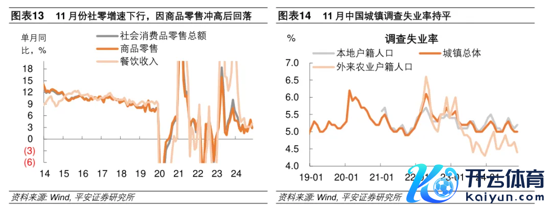 从名额以上商品数据看,波及以旧换新策略的汽车、居品零卖同比提速,对名额以上商品零卖增速的拉动提速0.8个百分点;但以旧换新波及的家电、通信器材类、文化办公用品等零卖额增速回落,对名额以上商品零卖拉动统统裁汰3.3个百分点;此外,不波及以旧换新的化妆品类、服装鞋帽针纺织品类零卖额同比由涨转跌,对名额以上商品零卖的拉动离别较上月裁汰1.8和1.1个百分点。 掂量高频数据不雅察“双十一”大促情况,交通运输部统计的邮政快递揽收量关于住户网上什物毁坏具有衔尾兴致,该主义9月份同比增长28.5%,10月增速进步至33.9%,到11月增速回落至29%。不外,12月以来邮政快递揽收数据再度走强,斥逐12月15日近四周邮政快递揽收量同比增长34.5%。年末“以旧换新”策略插足尾声,重叠春节本领提前,商品毁坏或将在12月迎来冲量。城镇打听休闲率总体稳固,结构分化。11月城镇打听休闲率5.0%,捏平于上月。结构上,腹地户籍东说念主口打听休闲率约5.2%,较上月进步0.1个百分点;外来农业户籍东说念主口打听休闲率仅4.4%,较上月回落0.3个百分点。11月份百度搬动指数同比增长8.8%,增速较10月份进步0.2个百分点,且高于前10个月-1.7%的累计同比增速,以此揣测,2025年春节较早,出门务工东说念主员返乡潮或有提前。