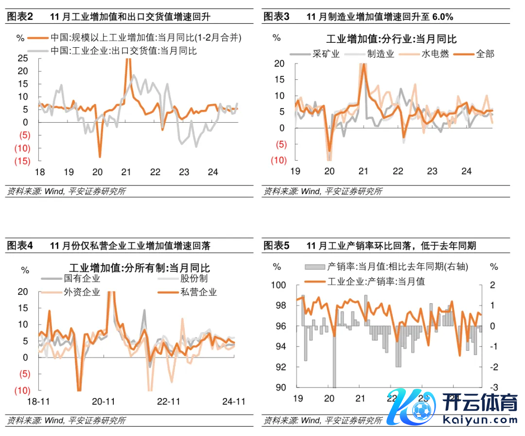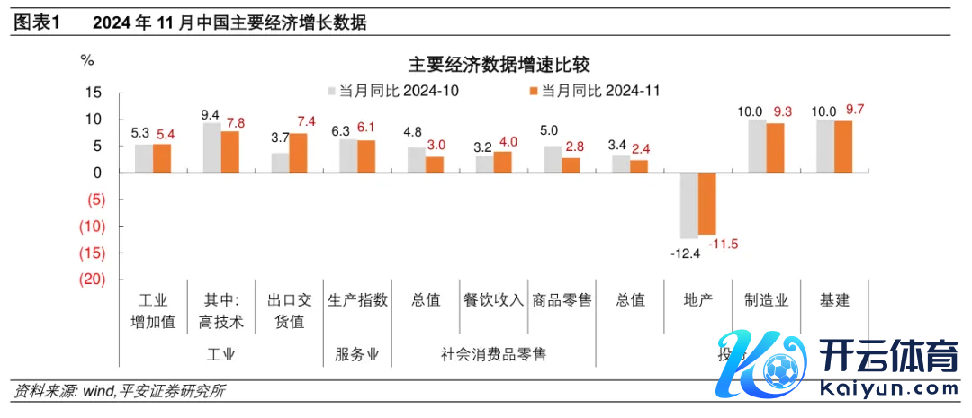 2024年11月,主要经济增长数据旯旮回落,分娩端工业较快增长,而服务业增速放缓,需求端毁坏和投资旯旮走弱。在分娩端,11月服务业分娩指数同比增长6.1%,较上月回落0.2个百分点,为年内次高点;工业增多值同比增长5.4%,较上月进步0.1个百分点,重回6月以来高点。在需求端,出口交货值增速进步,但社会毁坏品零卖总数和固定金钱投资增速回落,其中制造业和基建投资支捏有所裁汰。环比喻面,国度统计局发布的11月工业增多值、固定金钱投资、社会毁坏品零卖总数的季调环比数据年化离别增长5.7%、1.9%、1.2%,保捏增势。