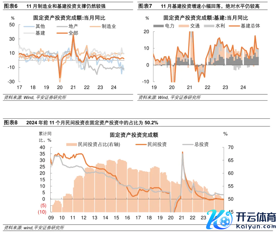 尽管11月单月增速放缓,但基建投资和制造业投资快于沿途投资增长,对投资的支捏作用昭着。基建投资方面,11月基建投资单月同比增长9.7%,主要支捏在于“两重”神情的鼓吹,但旯旮上较上月回落0.3个百分点。11月份新增专项债刊行放缓,所在政府更多关心再融资债券刊行,以置换隐性债务。制造业投资方面,11月制造业投资单月同比增长9.3%,虽较上月回落0.7个百分点,但增速仍处较高水平。大限制斥地更新策略对投资的拉动仍强。斥地购置投资较快增长。1-11月份,斥地工器用购置投资同比增长15.8%,增速比沿途投资高12.5个百分点。统计局新闻发布会示意,前11个月斥地工器用购置投资对沿途投资增长的孝顺率为65.3%,比1-10月份提高2.0个百分点。