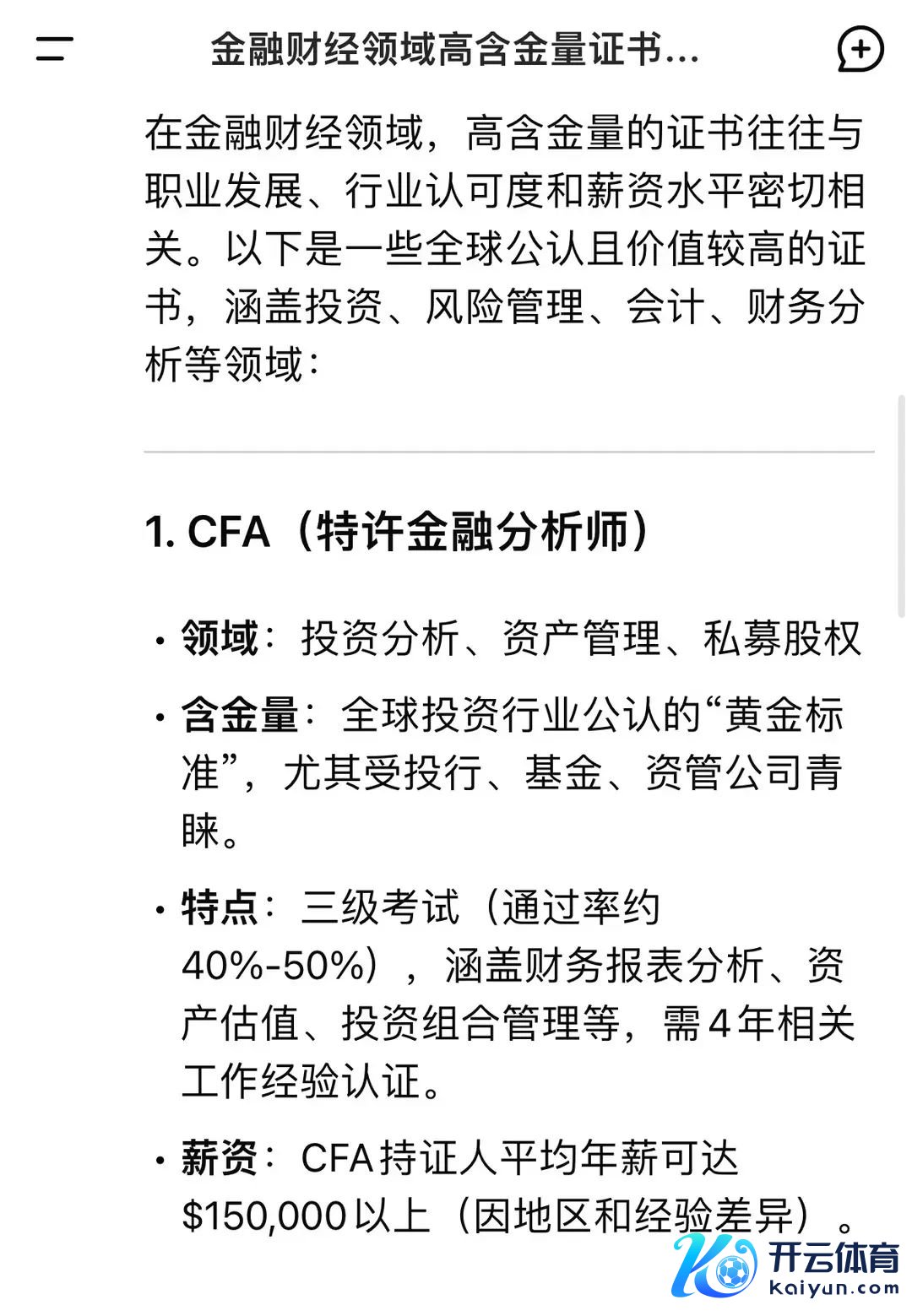在DeepSeek的谜底中,稳居TOP1位置的CFA(Chartered Financial Analyst,特准金融分析师)是全球金融投资畛域最严格亦然最具巨擘的文凭,被誉为“金融行业东谈主才的黄金门径”。