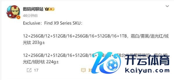 快科技 8 月 29 日音书欧洲杯体育,博主数码谈天站爆料,OPPO Find X9 模范版提供 12GB+256GB、12GB+512GB、16GB+256GB、16GB+512GB 和 16GB+1TB 五种弃取,有霜白 / 雾黑 / 追光红 / 绒光钛四种配色可选,分量约为 203g。