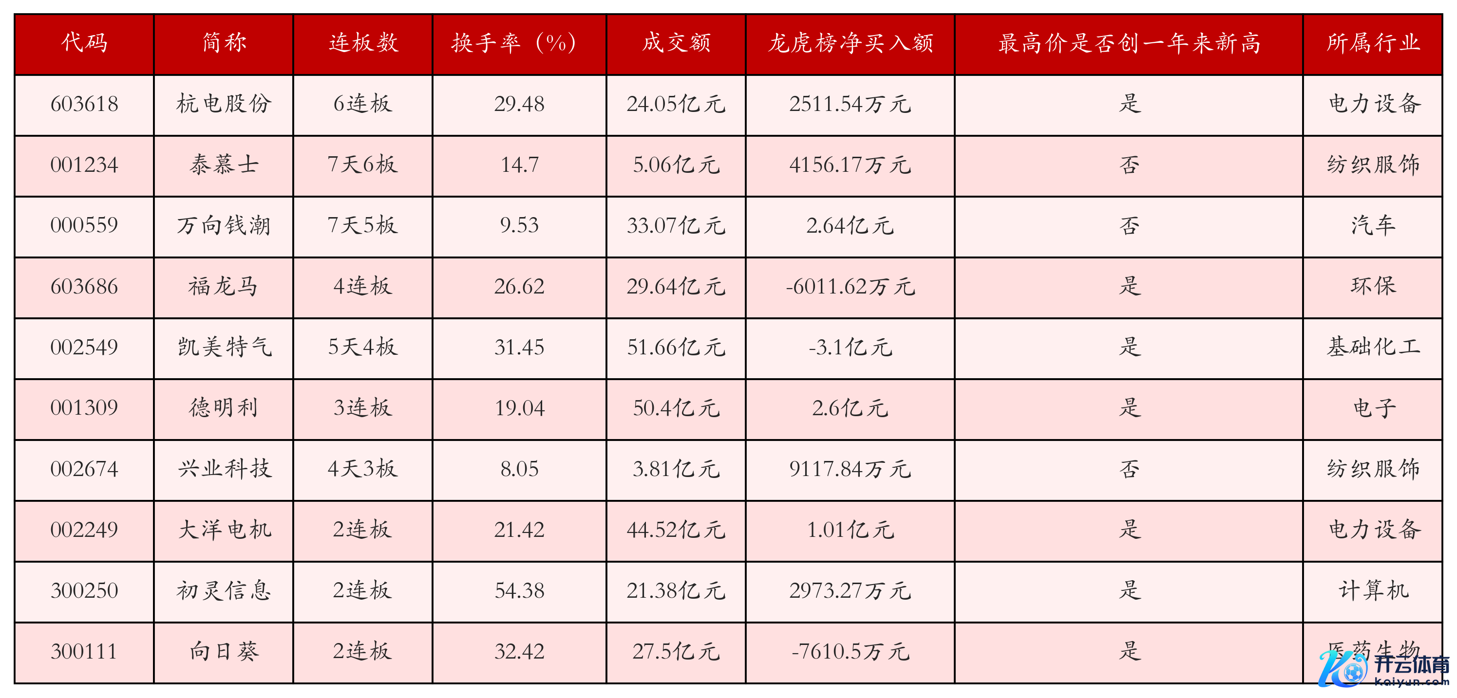 汗漫9月23日收盘,上证综指下降0.18%,收于3821.83点,深证成指下降0.29%,收于13119.82点,创业板指上升0.21%,收于3114.55点。本日沪深两市A股绸缪54只涨停,空洞面前连板数以及当日龙虎榜数据,其中较为强势的前三只个股差异为:杭电股份(603618)、泰慕士(001234)与万向钱潮(000559)。本日强势个股前10位具体数据见下表: